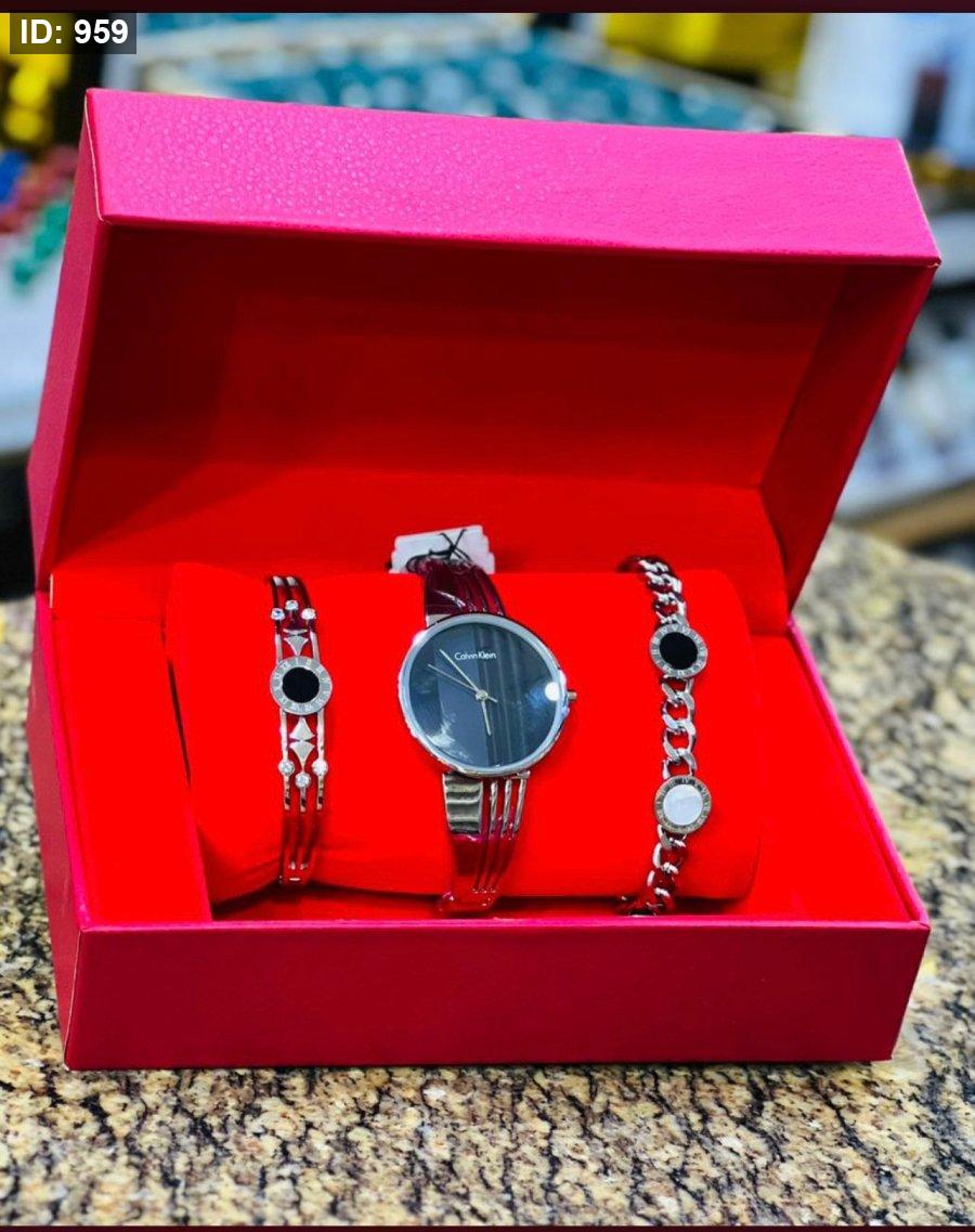 ساعة نسائية فضية اللون من كالفن كلاين مع اسوارتين ستالس ستيل